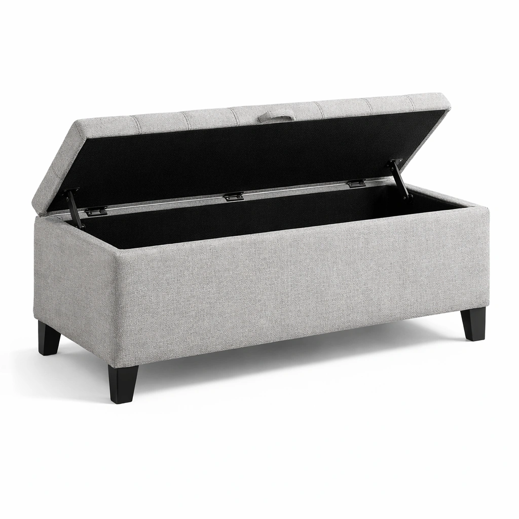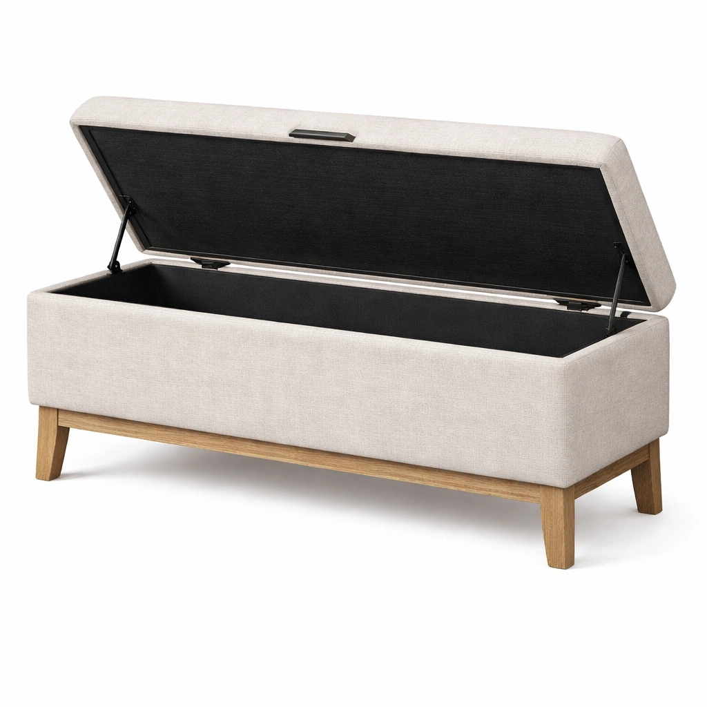 Banco con almacenamiento textil beige con patas de madera