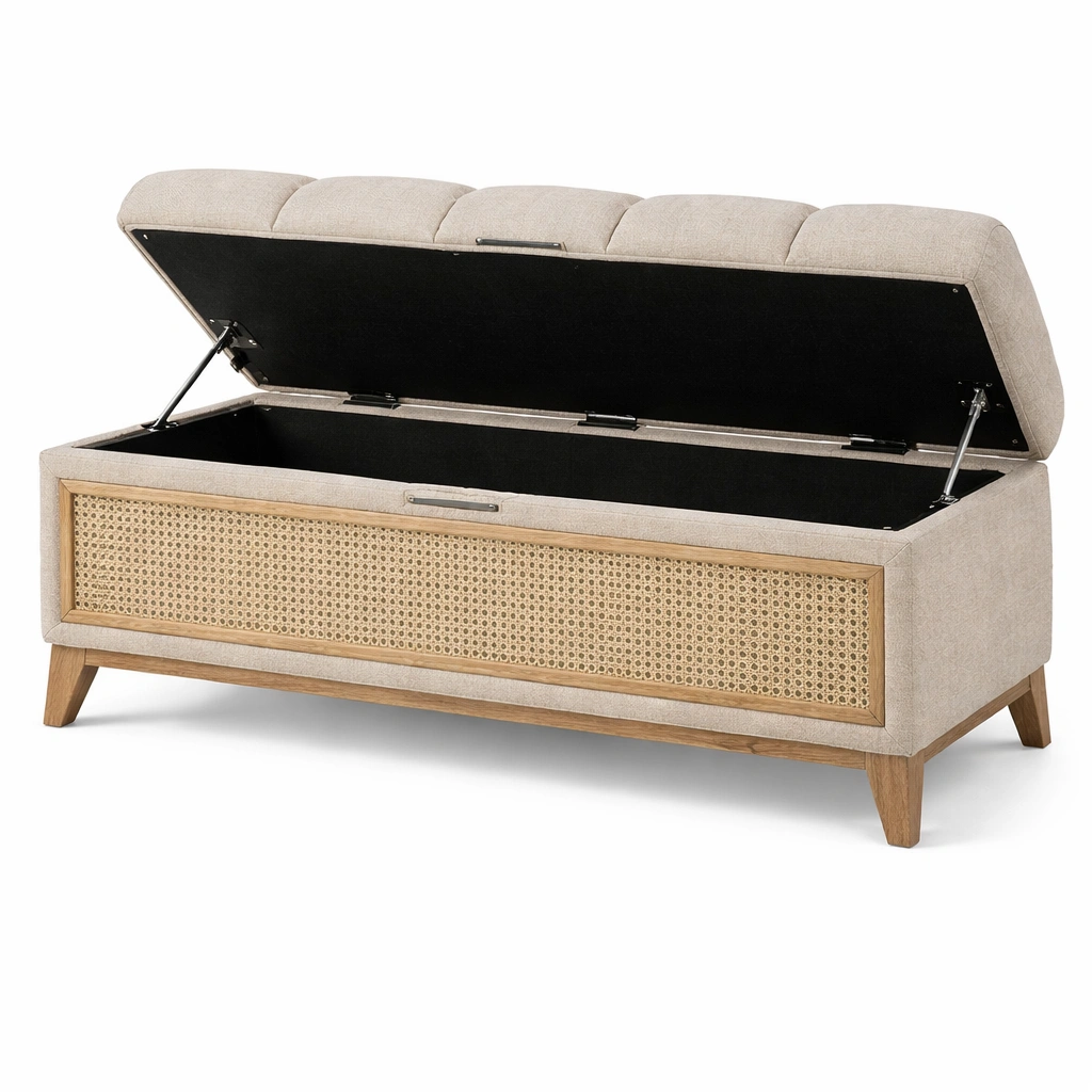 Banco con almacenamiento de madera y mimbre tapizado beige