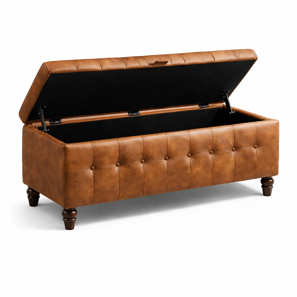 Banco con almacenamiento de cuero sintético marrón con tapa de bisagra