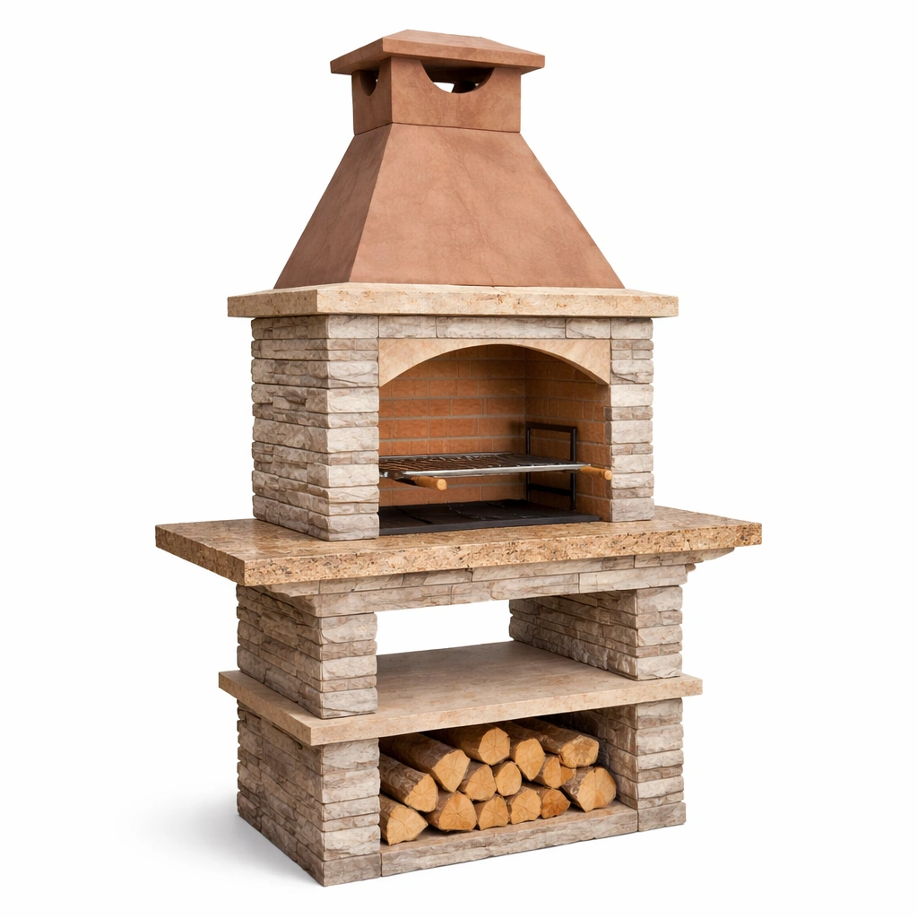 Barbacoa de ladrillo refractario y piedra con chimenea